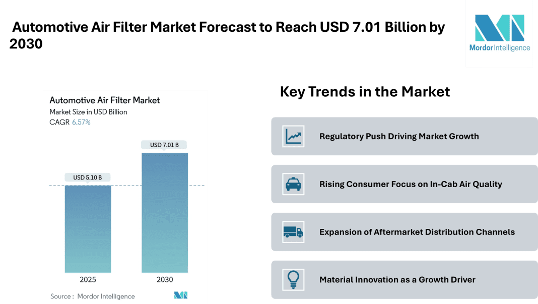 The automotive air filtration market size stands at USD 5.10 billion in 2025 and is forecast to reach USD 7.01 billion by 2030, advancing at a 6.57% CAGR.