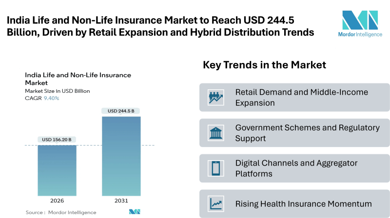 According to Mordor Intelligence, the India life and non-life insurance market size is valued at USD 156.2 billion in 2026 and is projected to reach USD 244.5 billion by 2031, reflecting a CAGR of 9.4% during the forecast period. This India life and non-life insurance market forecast highlights steady expansion across both protection and savings products, supported by regulatory clarity, rising income levels, and broader distribution reach.